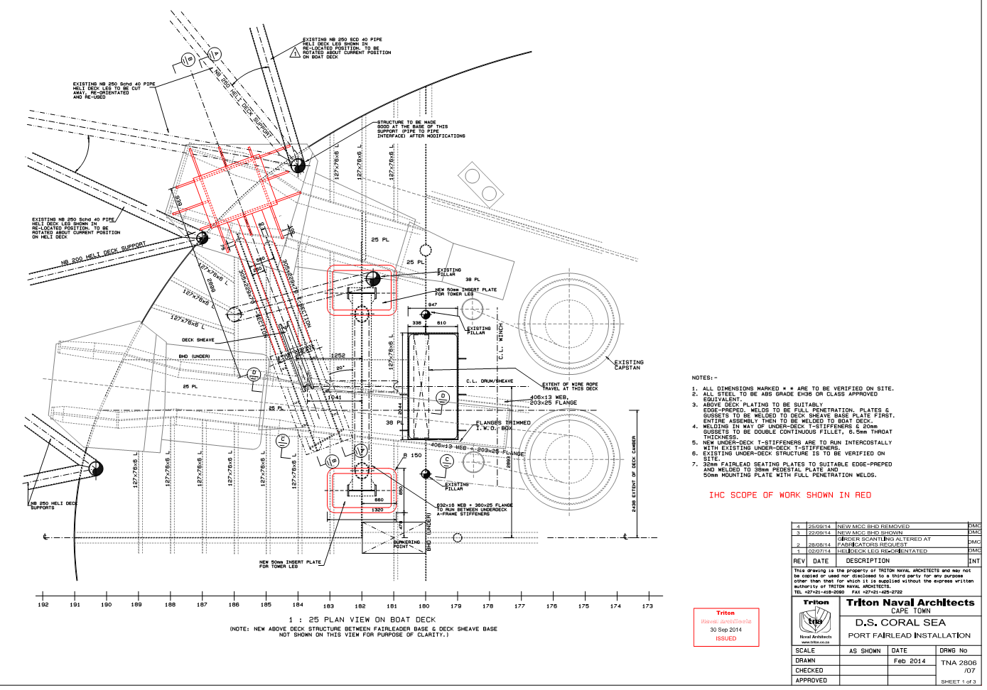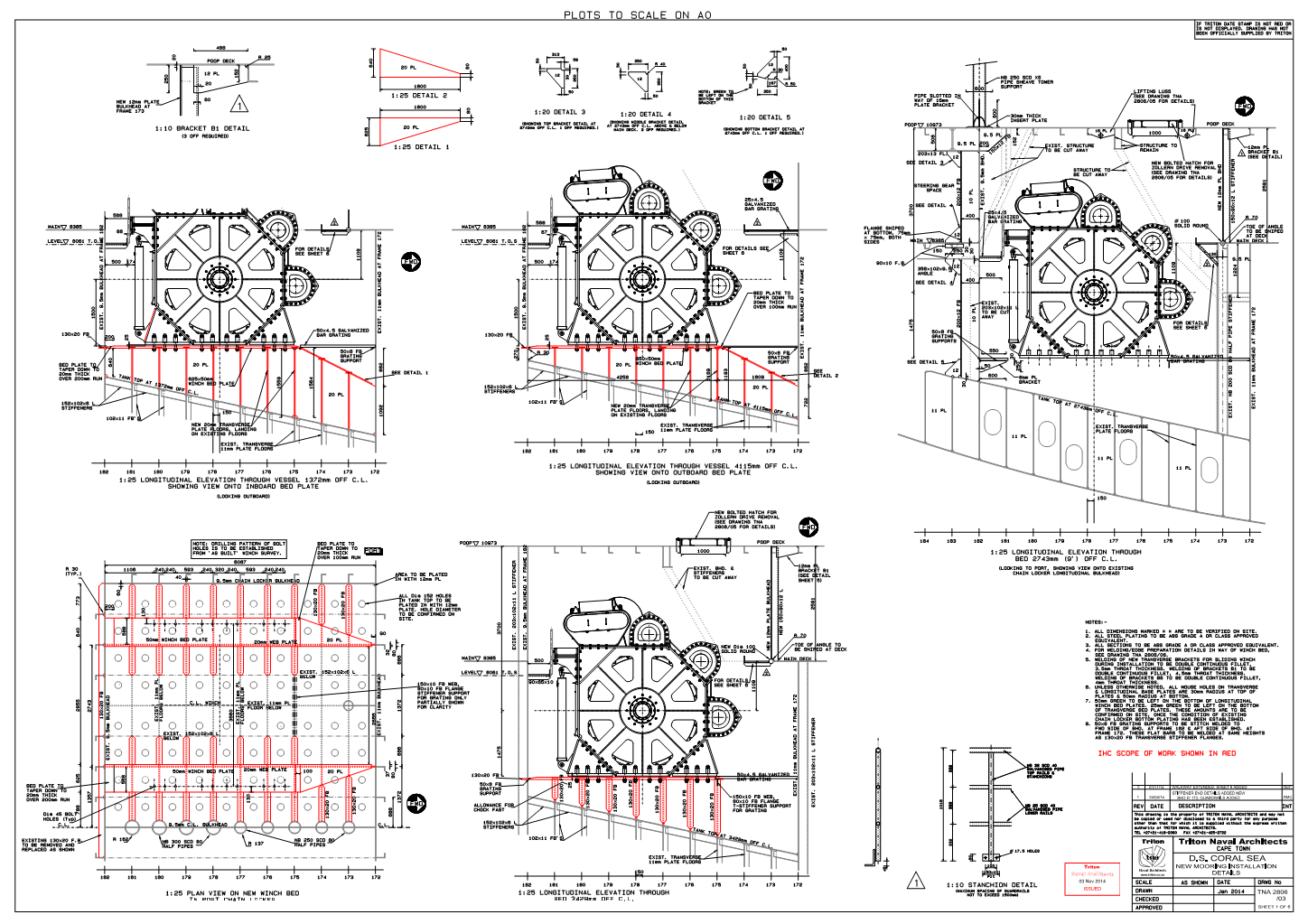 In 2006 Triton were contracted by IHC/MMP to design the structural support modifications to the vessel to accommodate a 52 tonne winch being installed in the Aft Stbd Chain Locker. The chain mooring system was stripped out. The new wire system required a sheave tower to allow suitable fleeting angles, deck bend sheave and high capacity deck fairleader, all of which required significant support.